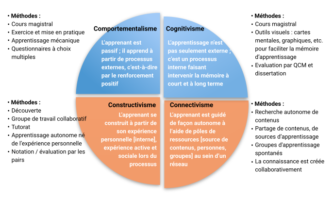 Il existe quatre théories bien connues de l'apprentissage : le comportementalisme, le cognitivisme, le connectivisme et le constructivisme. Elles décrivent différentes perspectives relatives aux mécanismes d'apprentissage.